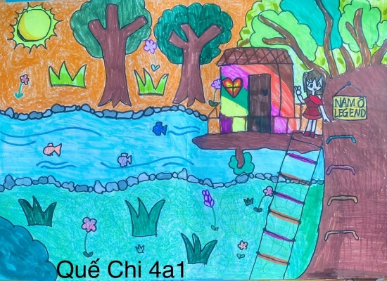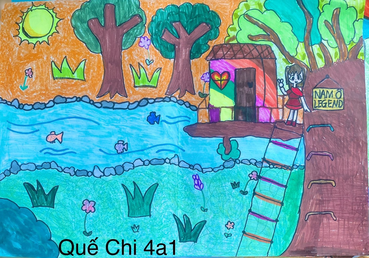 Ý nghĩa bức tranh của con là ngôi nhà nằm giữa thiên nhiên trù phú sông nước tươi đẹp ở Nam Ô Legend. Con muốn nói về thông điệp là mọi người hãy sống cùng với thiên nhiên và bảo vệ cảnh quan thiên nhiên hùng vĩ.