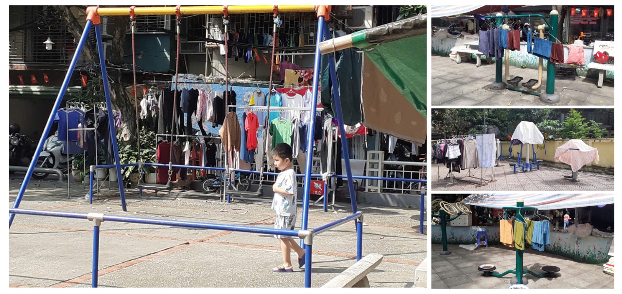 Không chỉ bị bãi đỗ xe lấn át, nhiều sân chơi trẻ em tại các khu tập thể Hà Nội còn bị biến thành “sân phơi” bất đắc dĩ, nơi dây phơi quần áo, chăn đệm chằng chịt che khuất cả ánh nắng. Những khoảng sân vốn dành cho trẻ em giờ đây trở thành nơi cư dân tận dụng để phơi đồ, với những giá phơi đồ, biến không gian cộng đồng thành “kho chứa” tạm bợ.