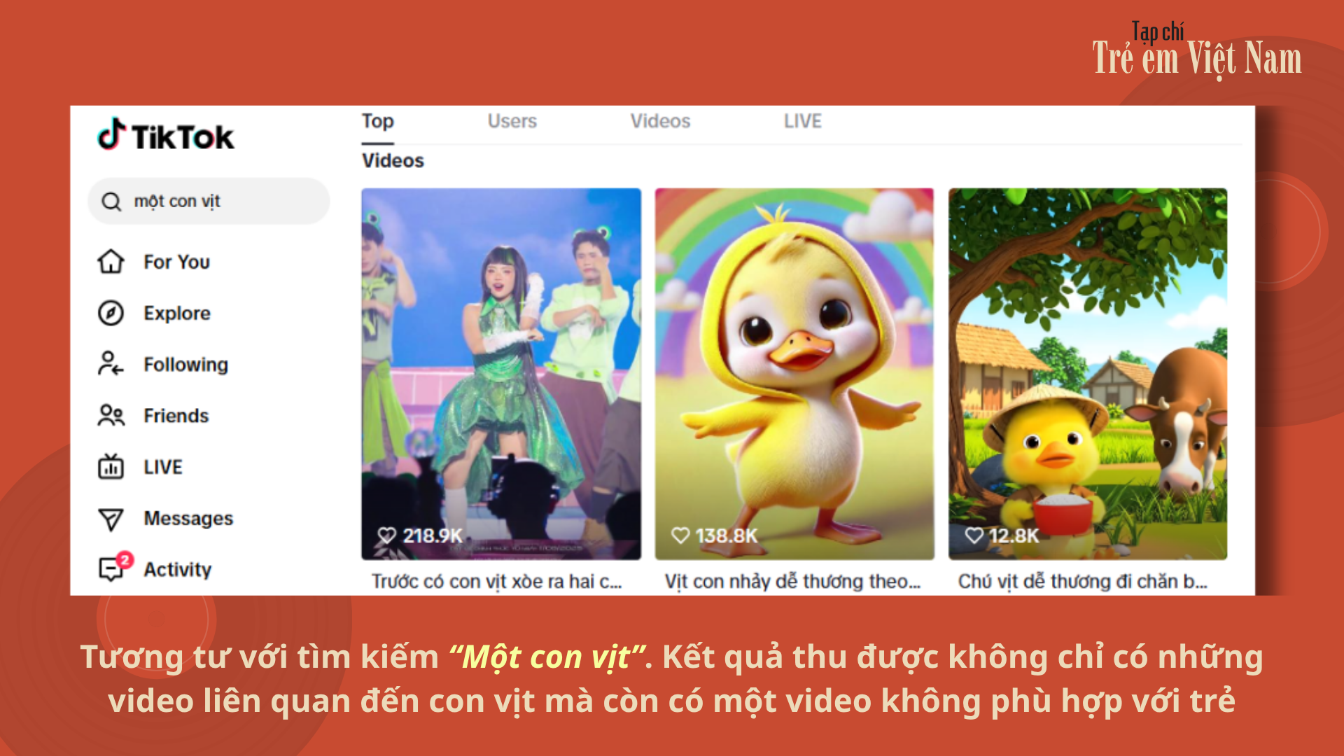 Chính từ kẽ hở ấy, hàng loạt video có vẻ “ngây thơ” lại len lỏi vào mục gợi ý cho trẻ em. Khi gõ từ khóa dành cho trẻ em “một con vịt” và “nhạc thiếu nhi”, bên cạnh những kết quả liên quan đến bài hát, vẫn len lỏi những video có chứa bài nhạc không phù hợp với trẻ em. Nhưng vì có hình ảnh trẻ em và từ khóa trùng khớp, những video đó được đưa vào mục gợi ý.