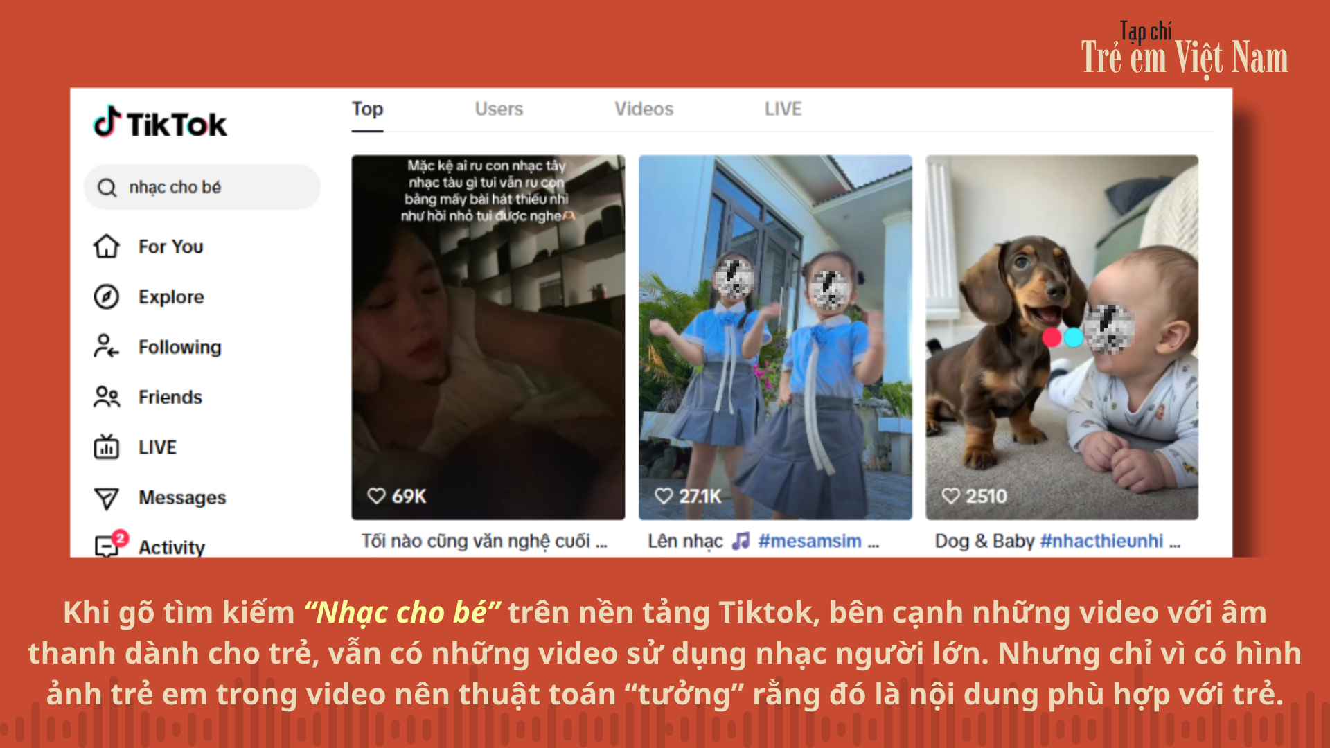 Nội dung trên các nền tảng mạng xã hội đều được tự động phân phối đến người dùng bằng thuật toán. Thuật toán không có cảm xúc, không có suy nghĩ để có thể phân biệt đâu là âm thanh phù hợp với trẻ. Trên các nền tảng mạng xã hội, chỉ cần một video có hình ảnh trẻ em nhảy múa hoặc chơi đồ chơi, hệ thống sẽ tự động nhận diện đó là nội dung “phù hợp với trẻ nhỏ” - bất kể phần nhạc nền hay lời bài hát có chứa những yếu tố người lớn, bạo lực hoặc gợi cảm.