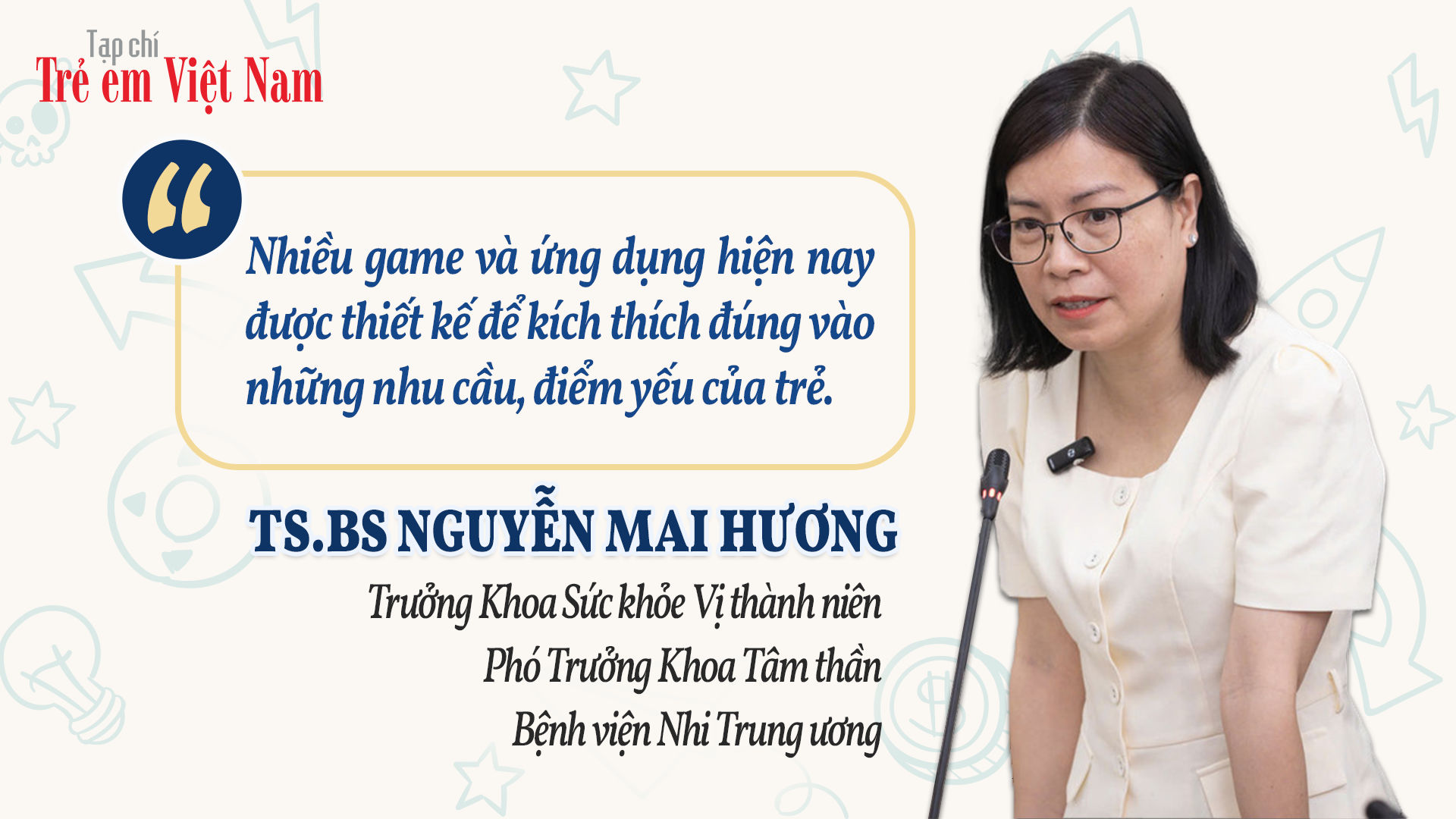 Cuối cùng, TS.BS Nguyễn Mai Hương gửi gắm lời khuyên rằng game và ứng dụng là một phần tất yếu của đời sống. Cha mẹ không nên xem chúng là trở ngại hay nguyên nhân gây rạn nứt mối quan hệ. Thay vào đó, hãy học cách sử dụng chúng một cách thông minh, để chúng trở thành công cụ giúp trẻ thư giãn, học hỏi và gắn kết. Cha mẹ cần là người bạn đồng hành, giúp trẻ xây dựng kỹ năng tự kiểm soát. Trong trường hợp tình hình vượt ngoài khả năng, cha mẹ nên đưa trẻ đến gặp bác sĩ hoặc chuyên gia tâm lý uy tín để được can thiệp phù hợp.